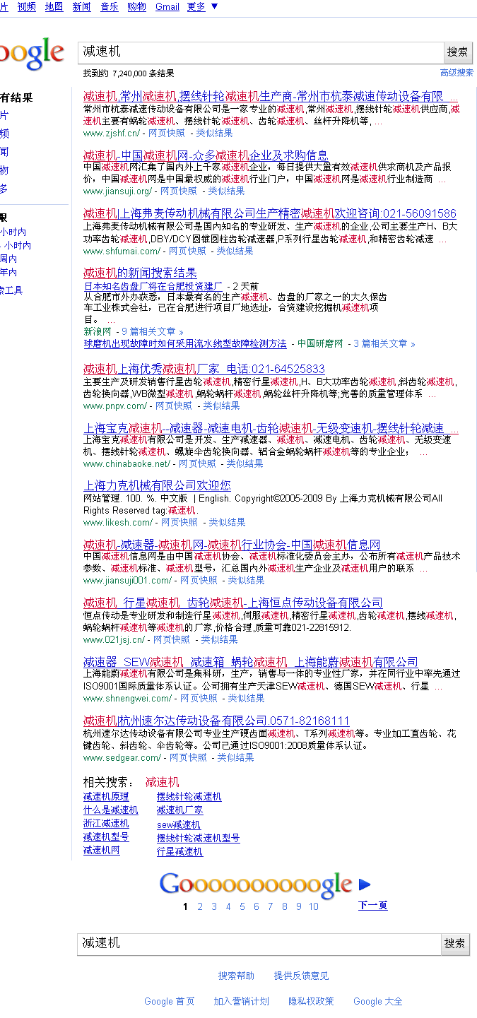 谷歌搜索引擎對本公司網站的收錄做瞭更新 ,輸入“減速機”,現在排名第八位 ,位於首頁下方。