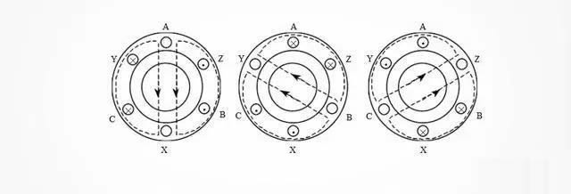 當(dāng)交流電相位θ=2400時,IC=0,IA爲負,IB爲正,此時,線端C、Z沒有電流,繞組AX電流從(cóng)X流進A流出,繞組BY電流從(cóng)B流進Y流出,由安培右手螺旋定則得到圖(c)中磁感線方向(如虛線箭頭所示)。