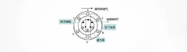 由於(yú)旋轉磁場不斷切割轉子中的閉合導體,産生感應電動勢和感應電流,再由轉子中的感應電流和旋轉磁場的相互作用産生電磁轉矩,使得轉子随著(zhe)旋轉磁場的方向同向運轉。比如籠型異步電動機,由於(yú)旋轉磁場順時針切割轉子導體,相當於(yú)導體逆時針轉動,運用右手定則,讓磁感線垂直穿過手心,拇指指向導體的運動方向,四指的方向就是感應電流的方向(如圖4所示籠型異步電動機轉子繞組電流的方向),然後應用左手定則,磁感線穿過手心,四指指向電流運動方向,大拇指方向即爲轉子受到電磁力的方向(如圖所示電磁轉矩矩T方向),在電磁力的作用下形成電磁轉矩,拖動轉子順著(zhe)旋轉磁場的方向轉動。