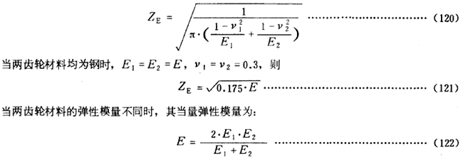 彈性系數ZE是用以考慮材料彈性模量E泊桑比v對赫茲應力的影響。其數值可按實際的材料彈性模量E和泊桑比v由式(120)計算得出。對於某些常用材料組合的ZE可參考表14查取 。