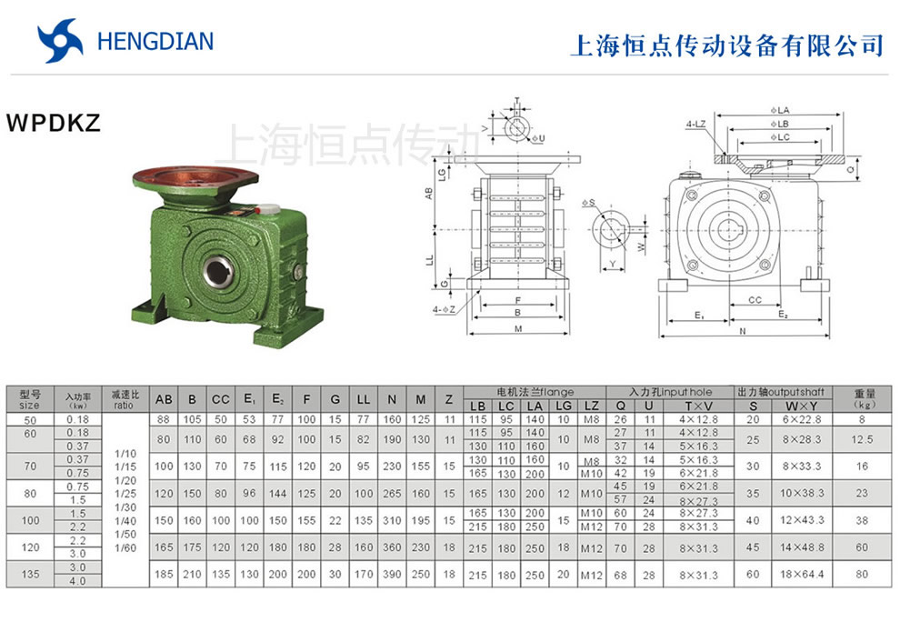 WPDKZ減速機軸指向表示方法.WPDKZ減速機法蘭輸入,軸輸出.機座号從50到135,可選速比從10到60.WPDKZ系列蝸輪蝸杆減速機選型指南,WPDKZ蝸輪蝸杆減速機的外形尺寸及安裝尺寸