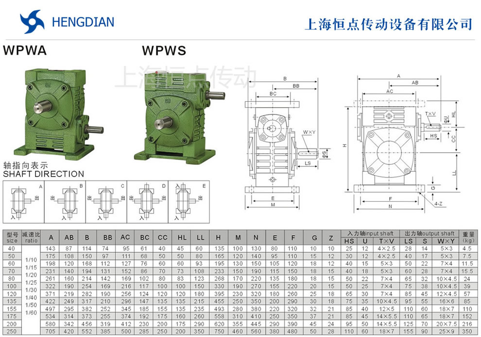選型指南,WPWA與WPWS減速機軸輸入,軸輸出.WPWA與WPWS減速機的外形尺寸及安裝尺寸WPWA與WPWS減速機軸指向表示方法.機座号40到250,速比10到60.