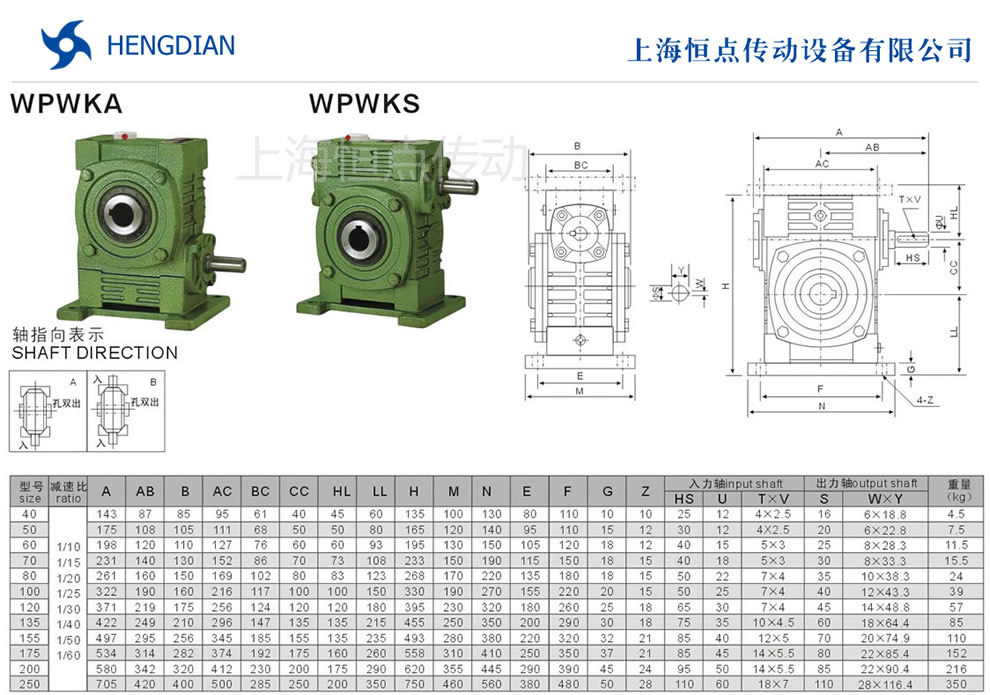 WPWKA與WPWKS萬能型減速機的外形尺寸及安裝尺寸.WPWKA與WPWKS萬能型蝸輪蝸杆減速機選型指南,WPWKA與WPWKS萬能型減速機軸輸入,軸輸出.機座号40到250,速比10到60.